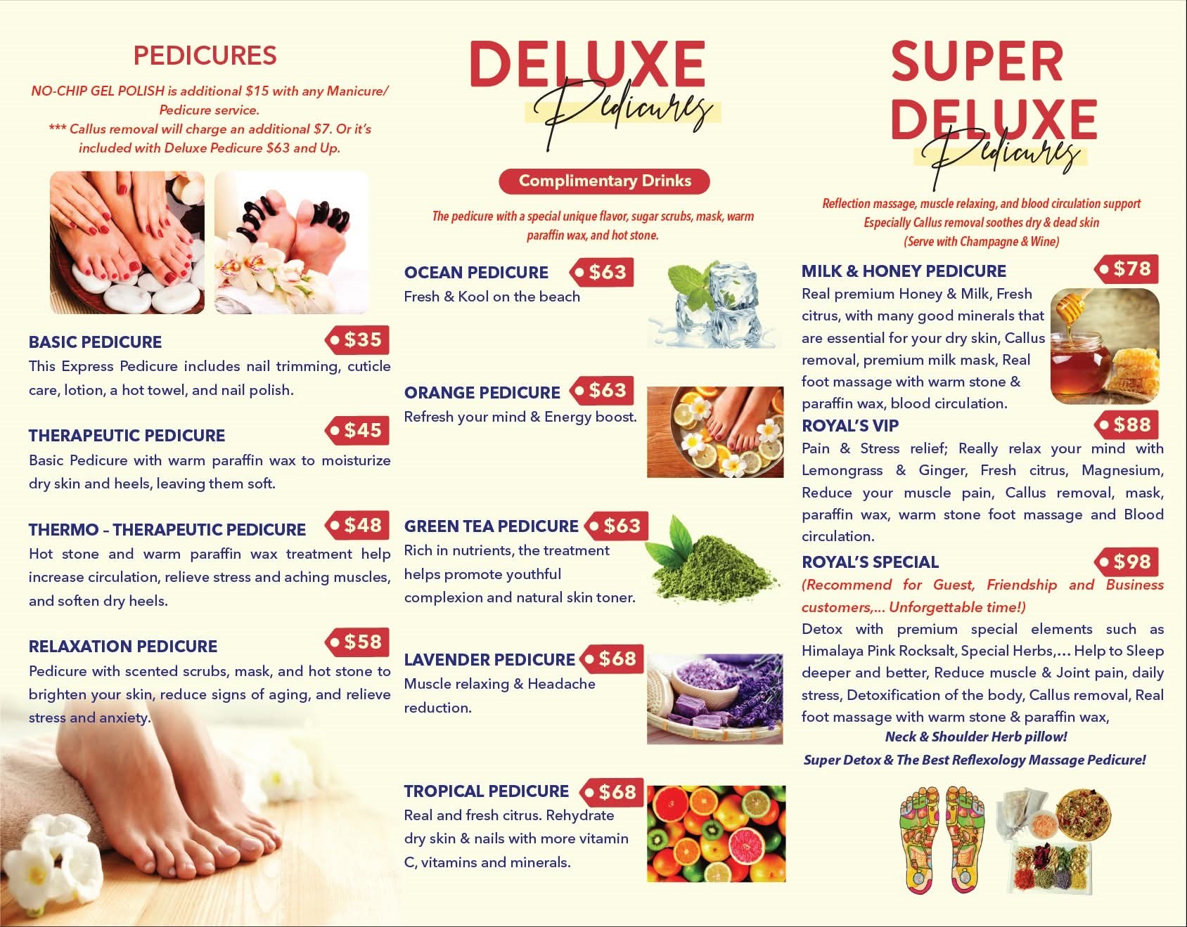 NO-CHIP GEL POLISH is additional $15 with any Manicure/Pedicure service. *** Callus removal will charge an additional $7. Or it's included with Deluxe Pedicure $63 and Up.
